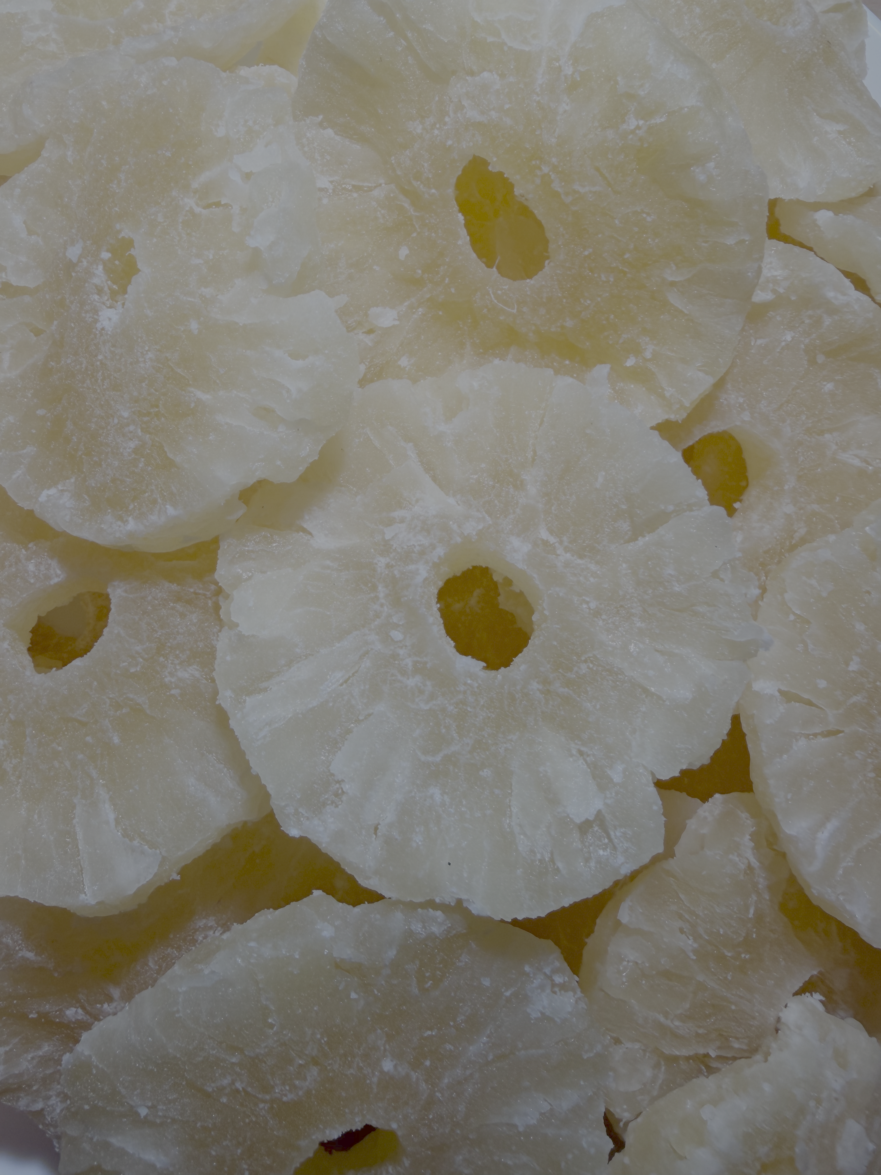 Ananas déshydratés. Ingrédients : ananas, sucre, acidifiant : acide citrique, conservateur : anhydride sulfureux.