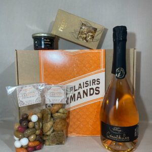 5 produits : 1 confiture 310g, crackers 100g, 1 bouteille (crémant de Loire ou l'ange vin ou gourmandise), 1 tartinable, 1 barre de nougat 100g nature, 1 sachet de chocolats assortis 120g. 7 produits : 1 confiture 310g, crackers 100g, 1 bouteille (crémant de Loire ou l'ange vin ou gourmandise), 1 tartinable, 1 barre de nougat 100g nature, 1 sachet de chocolats assortis 120g, 1 tablette de chocolat, 1 sachet mélange exotique 150g. Vous pouvez ajuster votre coffret selon vos envies en ajoutant, retirant ou remplaçant le ou les produit(s) de votre choix. Photo non contractuelle