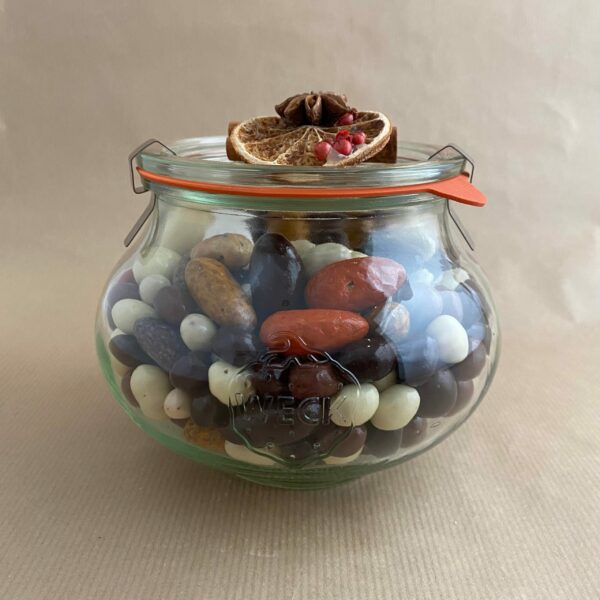 Assortiment d’amandes, caramels, et chocolats, enrobés de chocolat noir, lait, blanc. (85) (82)