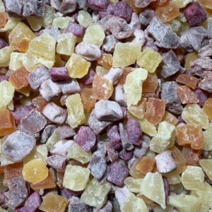 Cube Tutti Frutti. Ingrédients : papaye, ananas, purée de fraise, framboise et myrtille, sucre de canne, saccharose, pomme, fibres d’amans,
