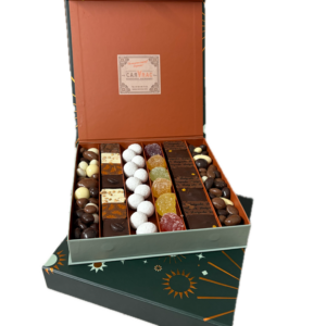 Barre de nougat 100g nature, sucre d’orge, moulage en chocolat au lait. Vous pouvez ajuster votre coffret selon vos envies