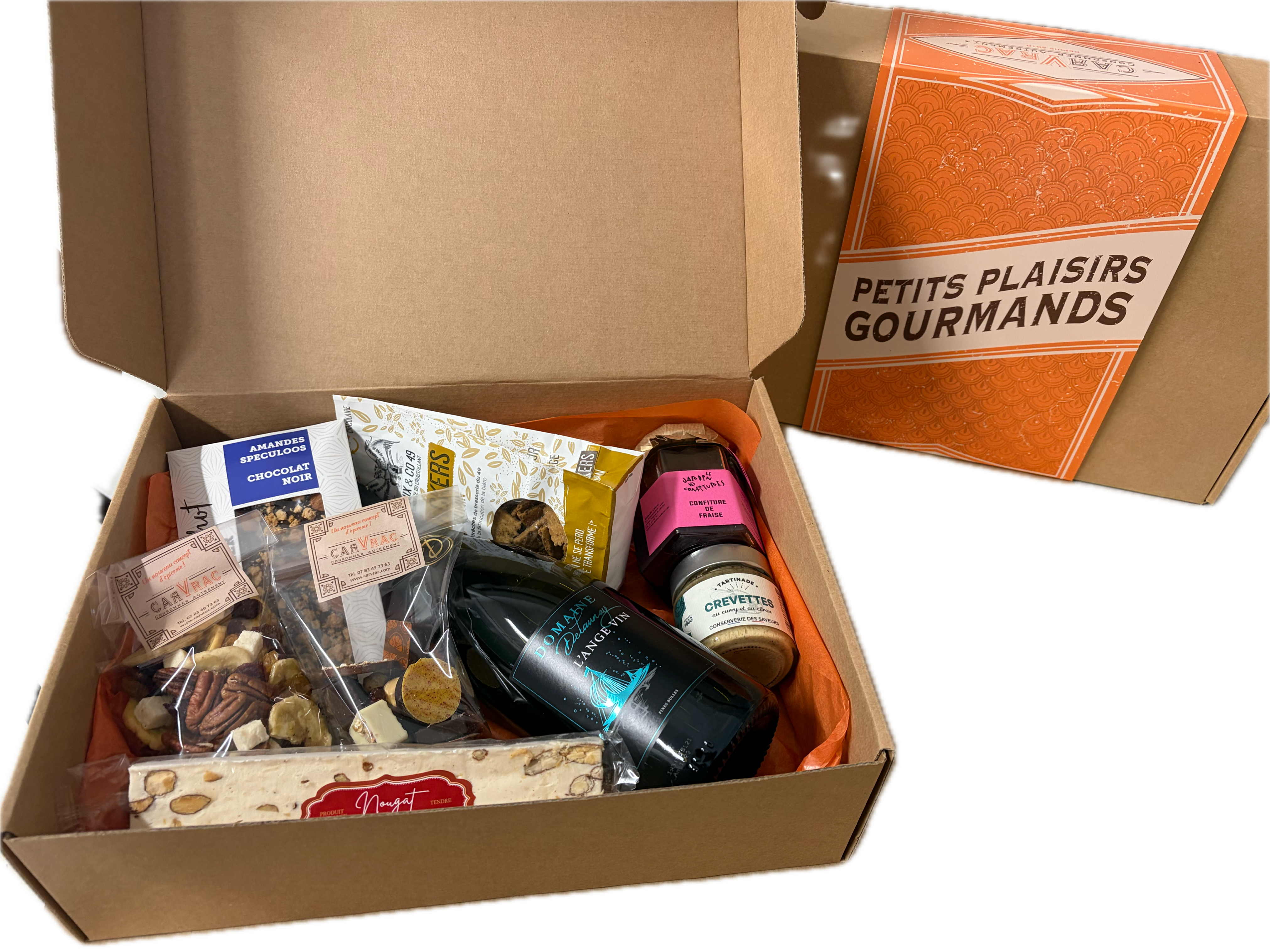 1 confiture 310g, crackers, 1 bouteille (crémant de Loire ou l’ange vin ou gourmandise), 1 tartinable, 1 barre de nougat 100g nature, 1 sachet de chocolats assortis 120g.