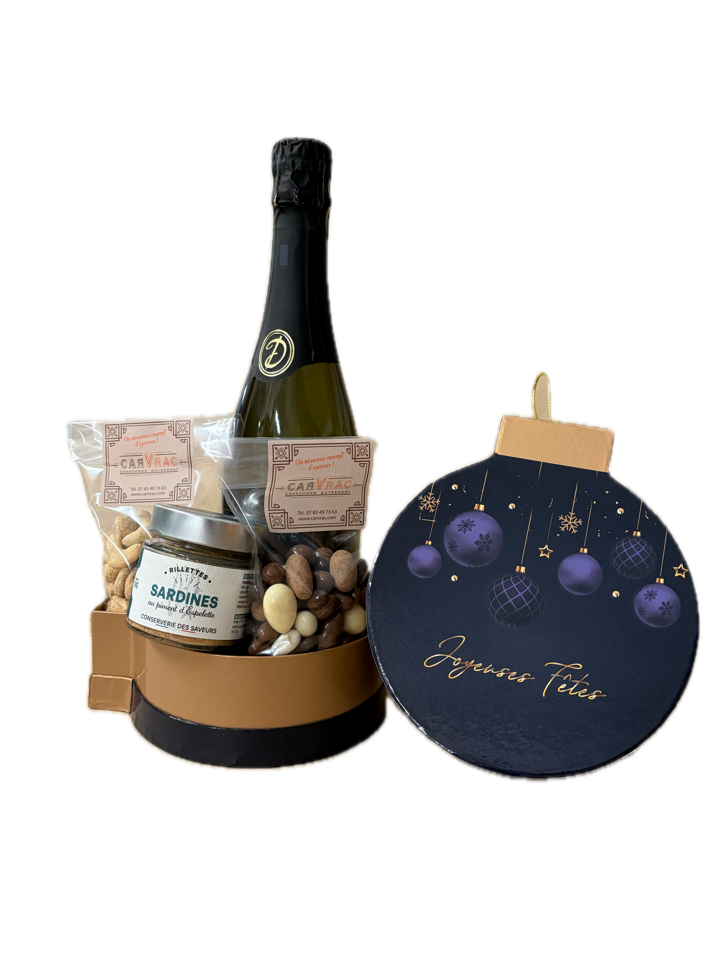 1 bouteille, 1 sachet de cajou, 1 tartinable, 1 sachet féérie de Noël 180g.
