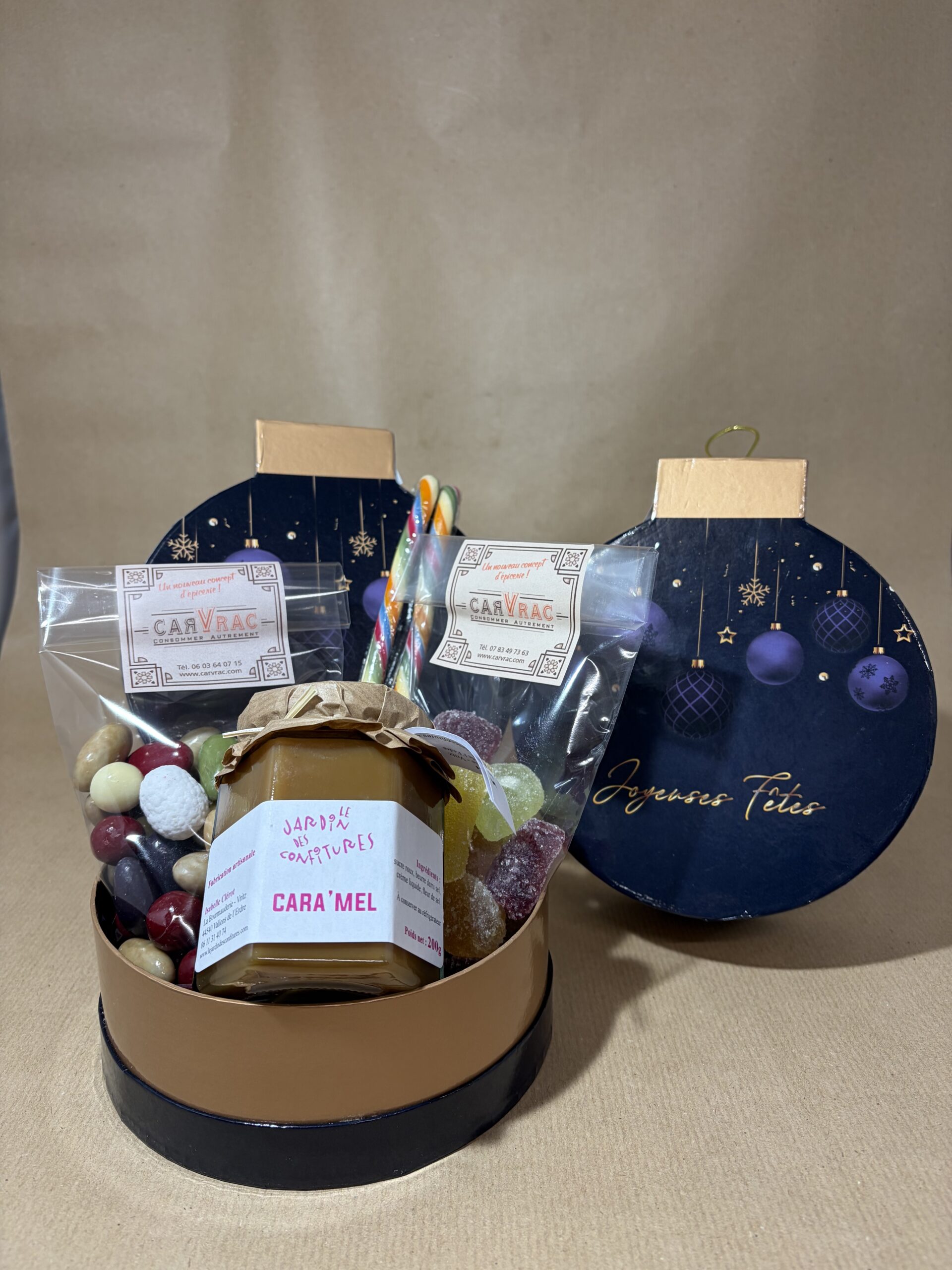 1 sachet féérie de noël 180g, 1 caramel 120g, 1 sachet de pâte de fruit 180g, 2 sucres d’orges