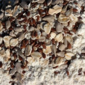 90% de farine de blé T55, 10% de mélange de graines : flocon d’avoine, tournesol, lin brun, sésame blanc et